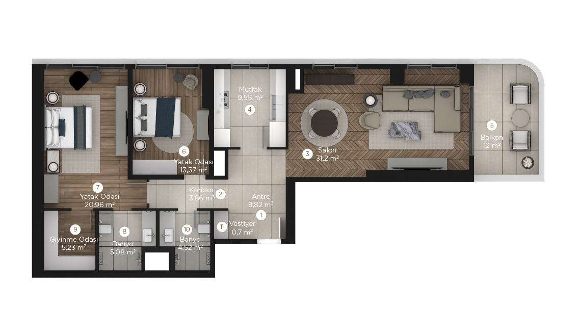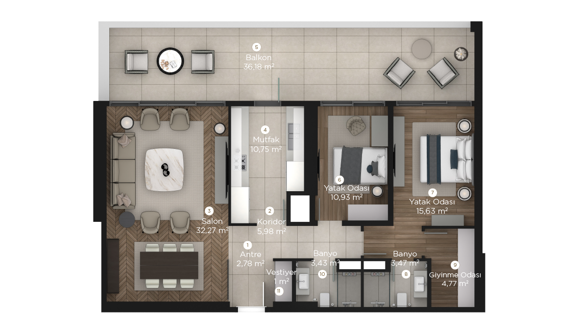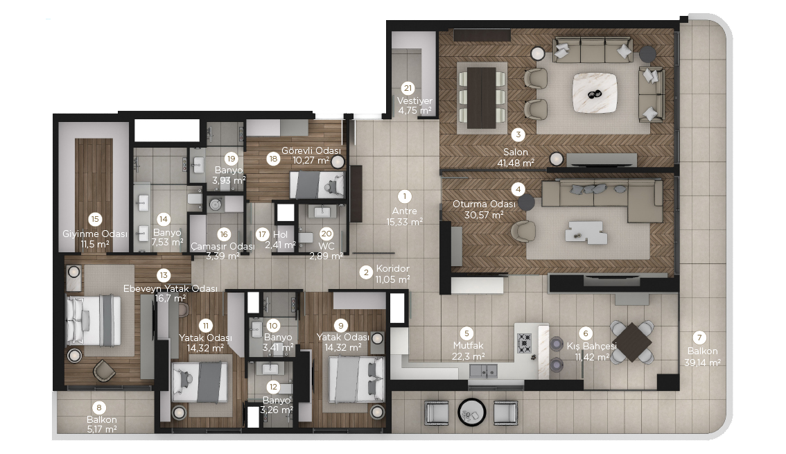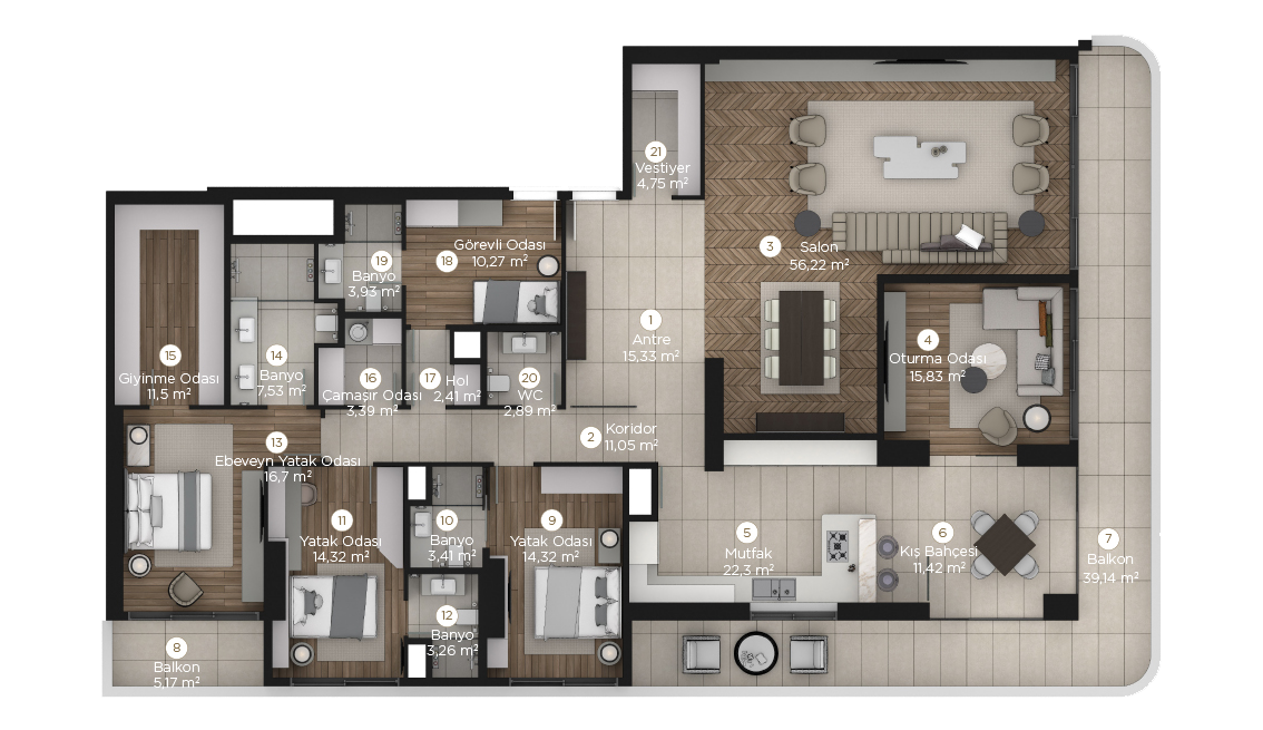 • 4+1 ve 5+1 daire tiplerinde ferah ve geniş balkonlar